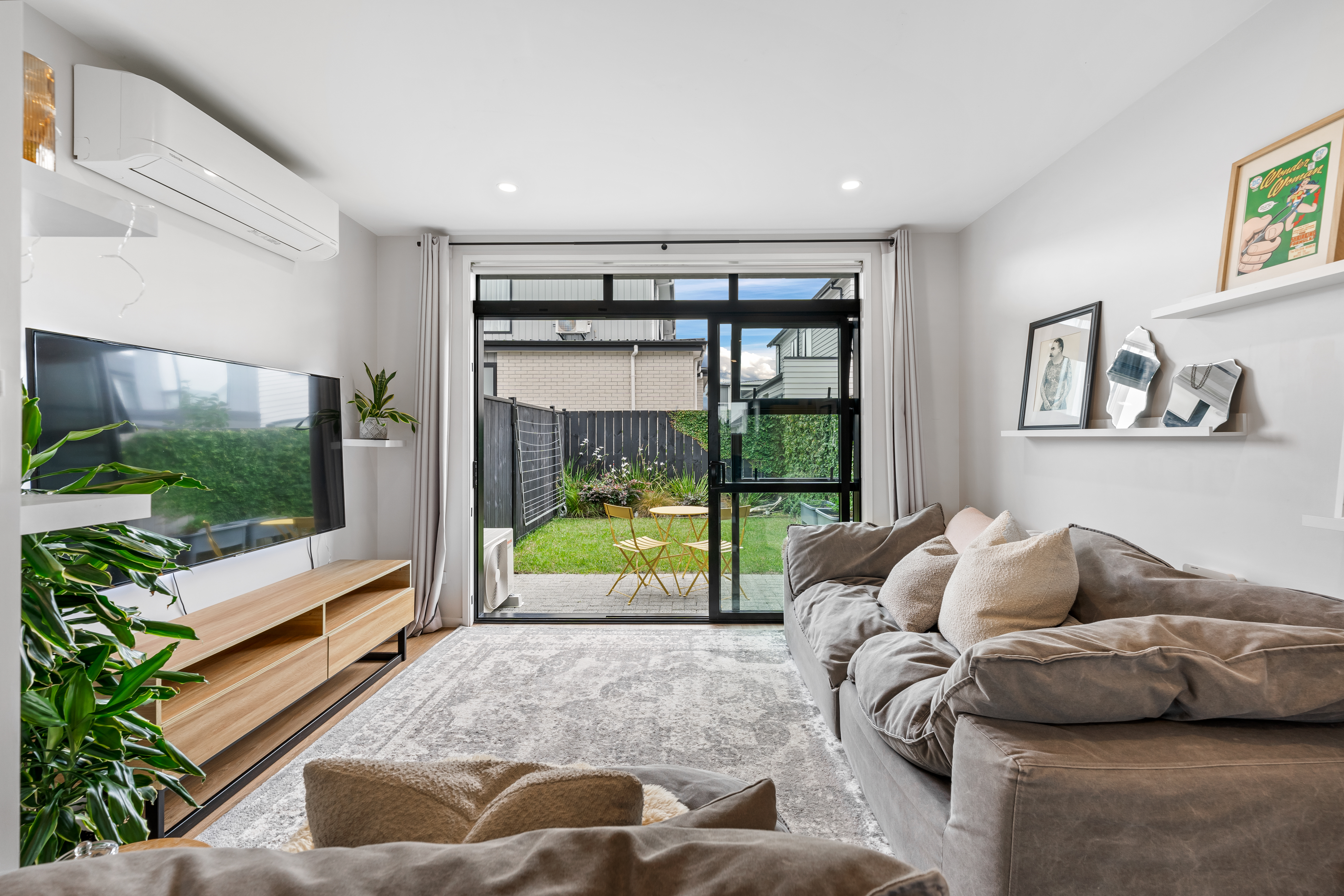 The smartly tiled bathroom with a bathtub acts as a semi-ensuite to the master. The laundry is integrated with a powder room, there is handy organised storage, a heat pump, and a single car park just outside the front door.